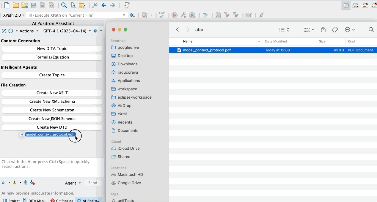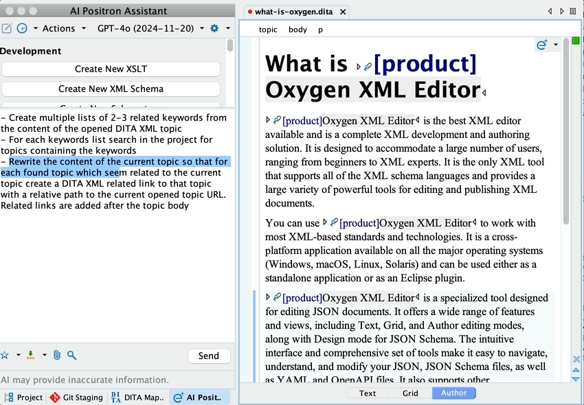 We initially started work on the AI Positron add-on for Oxygen XML Editor more than 2 years ago by creating useful AI actions to improve readability of content, correct grammar, translate, proofread, and so on. Gradually, we realized that even when invoking our carefully made prompts wrapped as such AI actions, you need flexibility to discuss with the AI further about results. So we added support to create custom AI actions specific to your needs. Such AI actions, based on prompts tuned by our or your experts, continue to be useful for precise use cases and for people who are just starting to use AI tools.